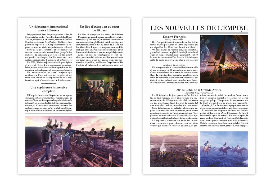 Dans le cadre de l’exposition immersive « Napoléon – L’Expérience VR », une identité visuelle éditoriale a été développée en référence directe aux codes graphiques de la presse du XIXe siècle. Cette démarche s’appuie sur une étude des typographies, des systèmes de mise en page et des textures propres aux journaux d’époque, afin de concevoir un journal d’exposition cohérent avec les objets historiques et muséographiques du projet. Ce support vise à accompagner la médiation culturelle en offrant aux visiteurs un document imprimé qui prolonge l’expérience immersive.