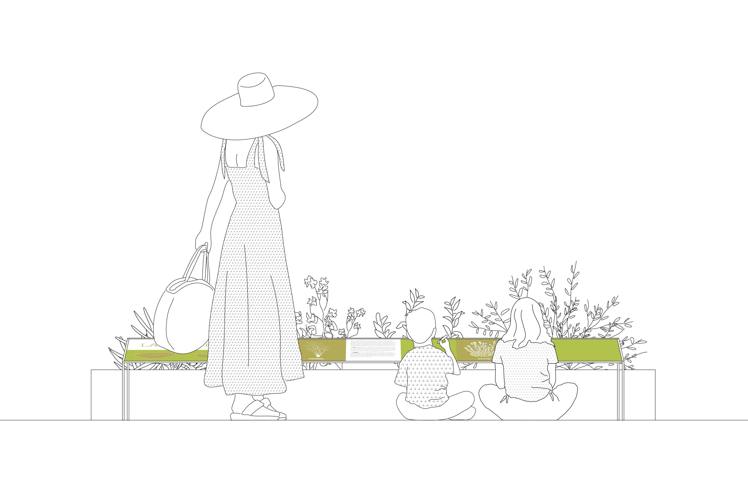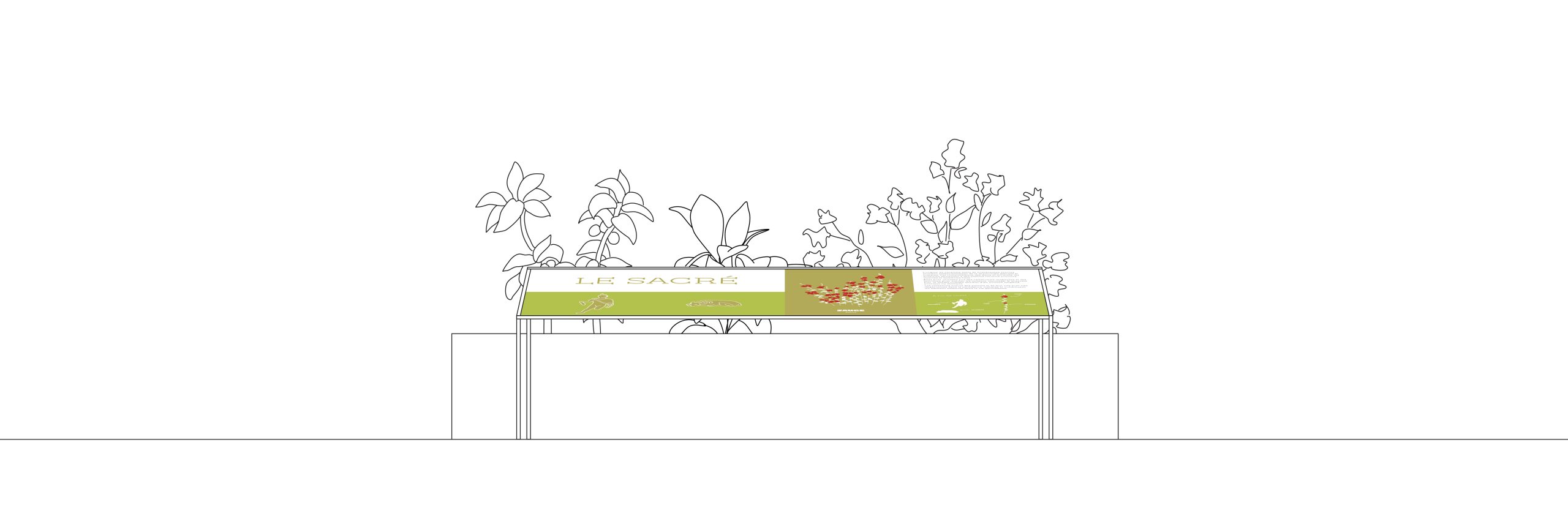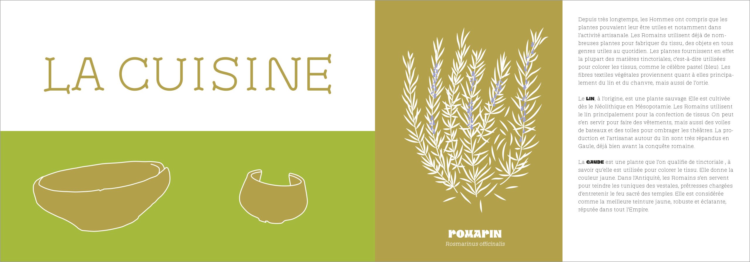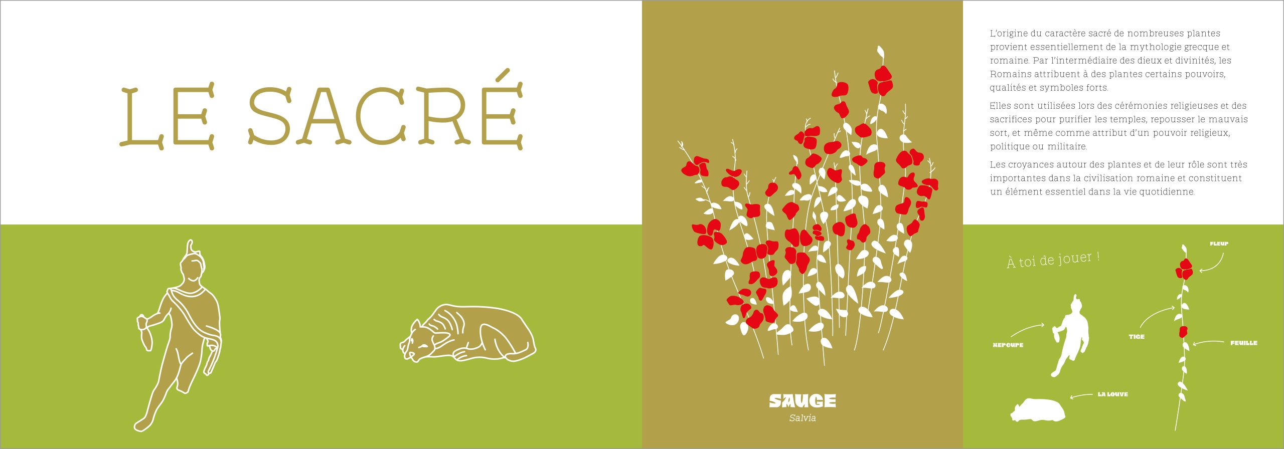 Les illustrations sont réalisées d’après le jardin in situ en dessin vectoriel. En lien avec la signalétique globale du site archéologique, ces panneaux utilisent un caractère de labeur dessiné à partir du trésor monétaire antique du pôle. C’est une typographie à l’aspect linéaire, filaire. Elle fait référence aux matrices de pièces de monnaies antiques dont les écritures étaient tracées à l’aide d’une pointe sèche.