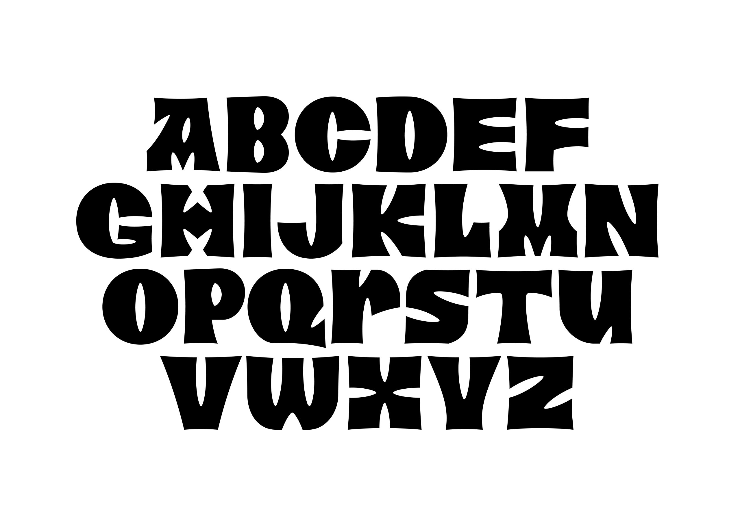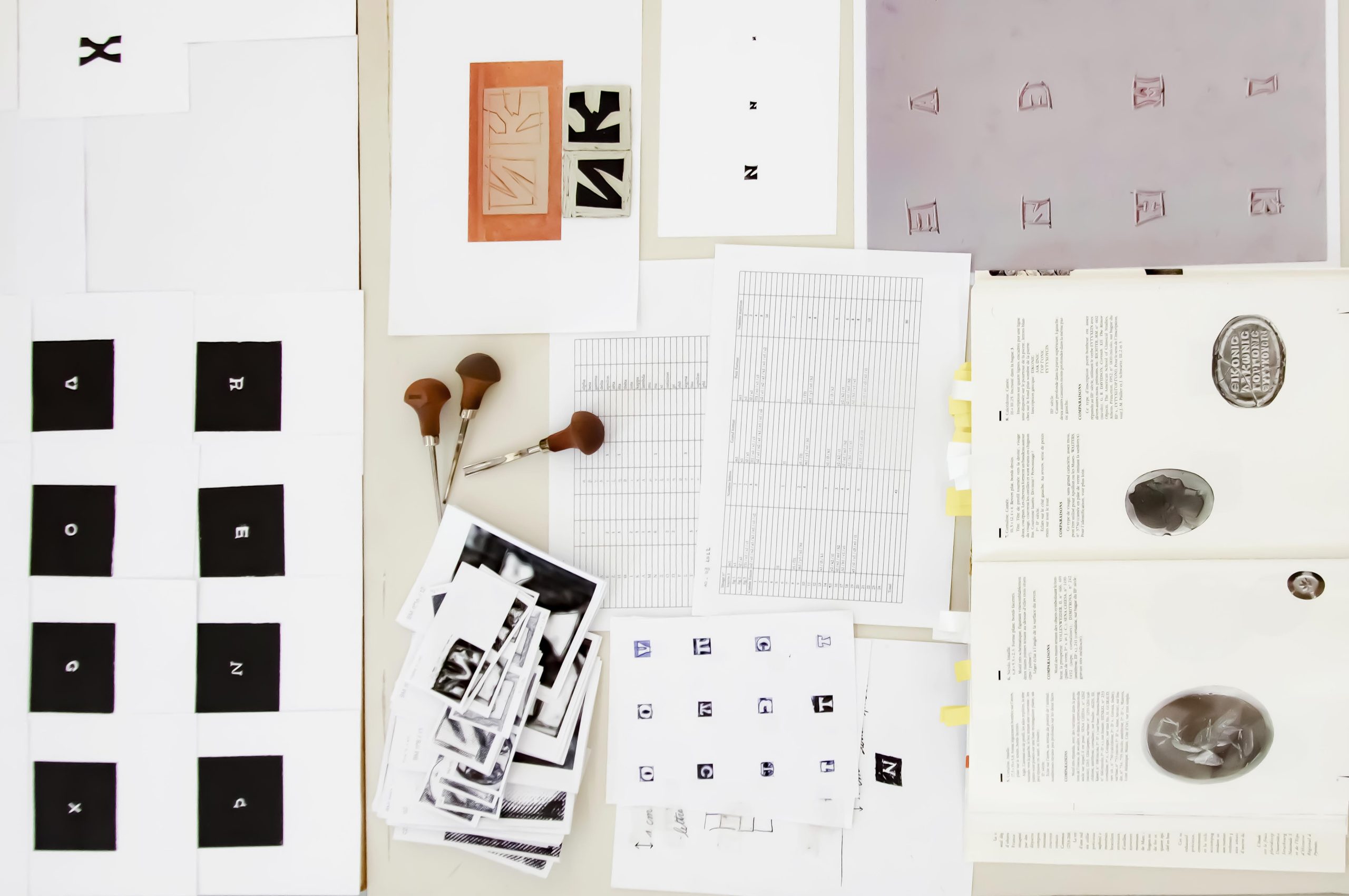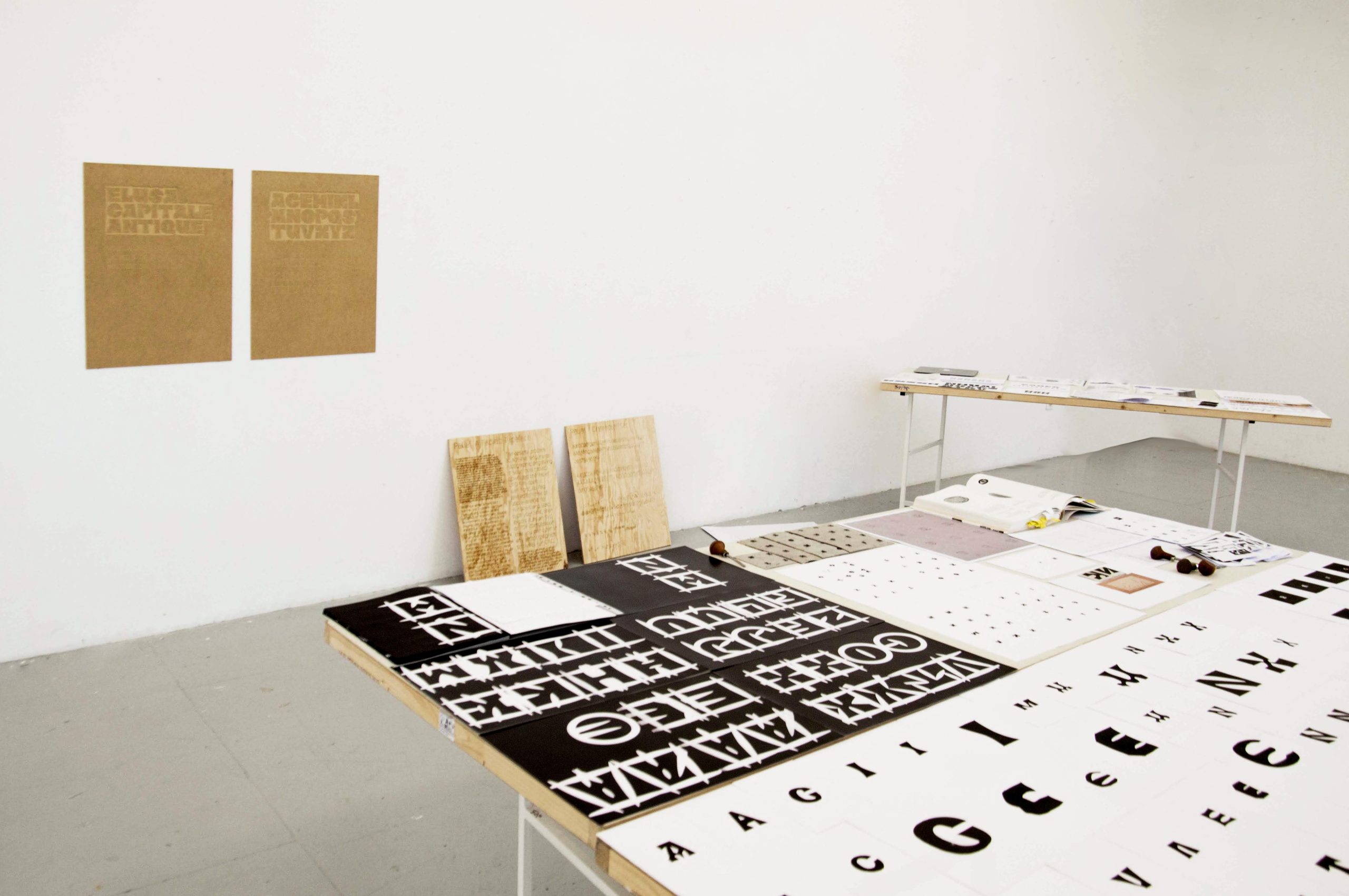 Modules en papiers découpés reproduisant des coups de poinçons et de burins afin de former les contours et les contreformes des lettres.