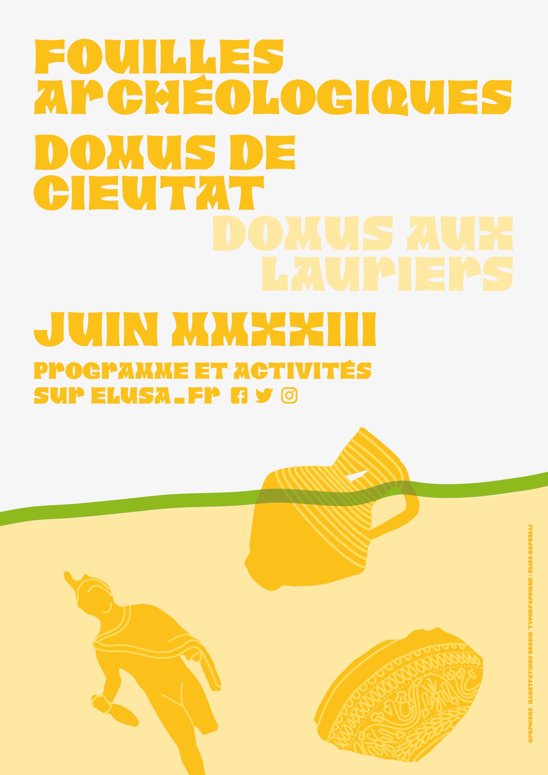 Le site archéologique de la Domus de Cieutat (Eauze, Gers - Occitanie) est une réserve de vestiges antiques romains en attente d’être fouillés et présentés au public. De précédentes fouilles archéologiques ont permis de constituer une collection d’objets du IIIe siècle de notre ère. Le pôle possède dans ses collections un camée, une bague de quatre lignes de texte gravé sur une pierre. Cette matière textuelle va servir au dessin d’une typographie incise pour l’identité visuelle du site.